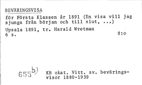 //// BEVÄRINGSVISA //// för Första Klassen år 1891 (En visa vill jag sjunga från början och till slut, ...) //// Upsala 1891, tr. Harald Wretman 6 s. 8:o //// K) //// KB okat. Vitt. sv. bevärings- //// u ' J visor 1880-1939 ////