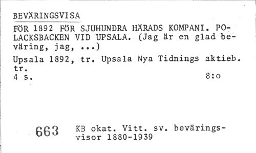 //// BEVÄRINGSVISA //// FÖR 1892 FÖR SJUHUNDRA HÄRADS KOMPANI. POLACKSBACKEN VID UPSALA. (Jag är en glad beväring, jag, ...) //// Upsala 1892, tr. Upsala Nya Tidnings aktieb. tr. //// 4 s. 8:o //// Of?Q K3 okat. Vitt. sv. bevärings- //// OU visor 1880-1939 ////