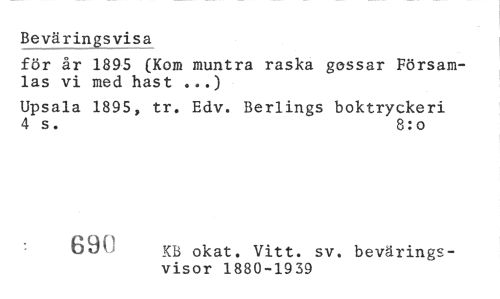 //// Beväringsvisa //// för år 1895 (Kom muntra raska gossar Församlas vi med hast ...) //// Upsala 1895, tr. Edv. Berlings boktryckeri 4 s. 8:o //// : 690 KB okat. Vitt. sv. bevärings- //// visor 1880-1939 ////
