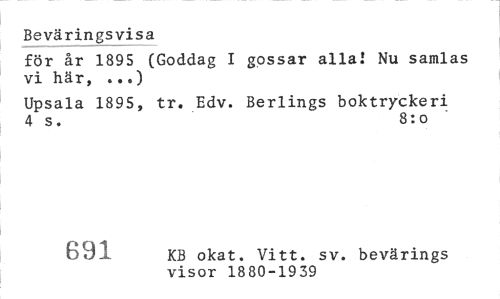 //// Beväringsvisa //// för år 1895 (Goddag I gossar alla! Nu samlas vi här, ...) //// Upsala 1895, tr. Edv. Berlings boktryckeri 4 s. 8:o //// 61.8 KB okat. Vitt. sv. bevärings- //// visor 1880-1939 ////