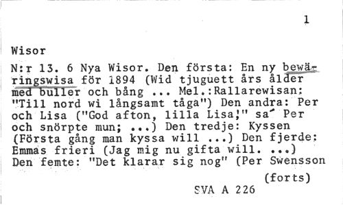 //// 1 //// Wisor //// N:r 13. 6 Nya Wisor. Den första: En ny bewä^ ringswisa för 1894 (Wid tjuguett års ålder med buller och bång ... Mel.:Rallarewisan: "Till nord wi långsamt tåga") Den andra: Per och Lisa ("God afton, lilla Lisa,'" sa" Per och snörpte mun; ...) Den tredje: Kyssen (Första gång man kyssa will ...) Den fjerde: Emmas frieri (Jag mig nu gifta will. ...) Den femte: "Det klarar sig nog" (Per Swénsson //// (forts) //// SVA A 2 26 ////