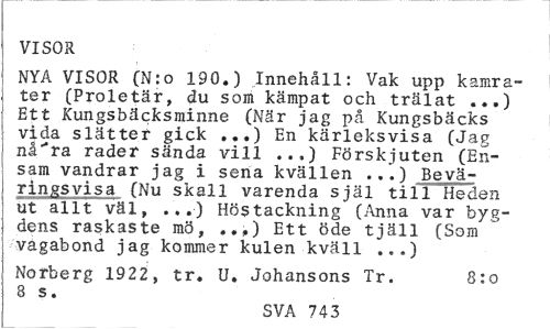 //// VISOR //// NYA VISOR (N:o 190.) Innehåll: Vak upp kamrater (Proletär, du som kämpat och trälat ...) Ett Kungsbäcksminne (När jag på Kungsbäcks vida slätter gick ...) En kärleksvisa (Jag nå"ra rader sända vill ..,) Förskjuten (Ensam vandrar jag i sena kvällen ..) Beväringsvisa (Nu skall varenda själ till Heden ut allt väl, ...) Hös täckning (Anna var bygdens raskaste mö, ...) Ett öde tjäll (Som vagabond jag kommer kulen kväll ...) //// Norberg 1922, tr. U. Johansons Tr. 8:0 //// 8 s. //// SVA 743 ////