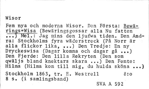 //// Wisor //// Fem nya och moderna Wisor. Den Första: Bewäringswisa (Bewäringsgossar alla Nu fatten ...) Mel.: Jag mins den ljufwa tiden. Den Andra: Stockholms fyra wäderstreck (På Norr är alla flickor lika, .,.) Den Tredje: En ny Dryckeswisa (Dagar komma och dagar gå ...) Den Fjerde: Den lilla Rekryten (Den som qwäljs bland knektars skara ...) Den Femte: Hilma (Hilma kom till mig, du hulda sköna ...) //// Stockholm 1863, tr. E. Westrell 8:0 //// 8 s* (i samlingsband) //// SVA A 592 ////