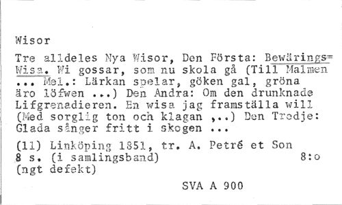 //// Wisor //// Tre alldeles Nya Wisor, Den Första: Bewärings-Wisa « Wi gossar, som nu skola gå (Till Malmen ... Mel.: Lärkan spelar, göken gal, gröna äro löfwen . ?.) Den Andra: Om den drunknade Lifgrenadieren. En wisa jag framställa will (Med sorglig ton och klagan ,..) Den Tredje: Glada sånger fritt i skogen ... //// (11) Linköping 1851, tr. A. Petré et Son 8 s. (i samlingsband) 8:o //// (ngt defekt) //// SVA A 900 ////