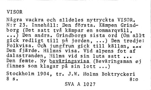 //// VISOR //// Några vackra och alldeles nytryckta VISOR. N:r 23. Innehåll: Den första. Kämpen Grindborg (Det satt två kämpar en sommarqväll, ...) Den andra. Grindborgs sista ord (Om alit gick redligt till på jorden, ...) Den tredje: Folkvisa. Och jungfrun gick till källan, m~m Den fjärde. Hilmas visa. Vid alpens fot af dalastranden, Hilma vid sin luta satt ... Den femte. Ny bgväjcjjxgjsjfisa (Beväringsman ej finnes som klagar på sin lott ...) //// Stockholm 1904, tr. J.W. Holms Boktryckeri //// 8 s. 8:o //// SVA A 1027 ////