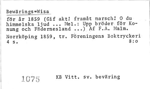 //// Bewärings-Wisa //// för år 1859 (Gif aktJ framåt marsch! O du himmelska ljud ... Mel.: Upp bröder för Konung och Fädernesland ...) Af F.A. Malm. //// Norrköping 1859, tr. Föreningens Boktryckeri 4 s. 8:o //// 1 Q^^j KB Vitt. sv. beväring ////