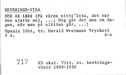 //// BEVÄRINGS-VISA //// FÖR ÄR 1898 (På våren nitti'åtta, det var den sjette maj, ...; Nog går det ann om dagen, när man på slätten går, ...) //// Upsala 1898, tr. Harald Wretmans Tryckeri 4 s. 8:o //// 370 KB okat. Vitt. sv. bevärings- //// visor 1800-1879 ////