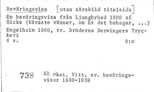 //// Beväringsvisa [utan särskild titelsida j //// En beväringsvisa från Ljungbyhed 1900 af Ricke (Käraste vänner, om Er det behagar, ...) //// Engelholm 1900, tr. Bröderna Derwingers Tryckeri //// 4 s. 8:o //// 738 °kat. Vitt. sv. bevärings- //// " visor 1880-1939 ////