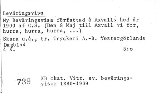 //// Beväringsvisa //// Ny Beväringsvisa författad å Axvalls hed år 1900 af C.S. (Den 8 Maj till Axvall vi for, hurra, hurra, hurra, ...) //// Skara u.å., tr. Tryckeri A.-B. Vestergötlands Dagblad //// 4 s . 8: o //// KB okat. Vitt. sv. bevärings- //// /*db visor 18SC-1939 ////