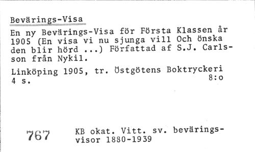 //// Bevärings-Visa //// En ny Bevärings-Visa för Första Klassen år 1905 (En visa vi nu sjunga vill Och önska den blir hörd ...) Författad af S.J. Carlsson från Nykil. //// Linköping 1905, tr. östgötens Boktryckeri 4 s. 8:o //// non KB okat. Vitt. sv. bevärings- //// /D ' visor 1880-1939 ////