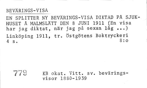 //// BEVÄRINGS-VISA //// EN SPLITTER NY BEVÄRINGS-VISA DIKTAD PÅ SJUKHUSET Ä MALMSLÄTT DEN 8 JUNI 1911 (En visa har jag diktat, när jag på sesxan låg ...) //// Linköping 1911, tr. Östgötens Boktryckeri 4 s. 8 : o //// 742 KB okat. Vitt. sv. bevärings- //// visor 1880-19 39 ////