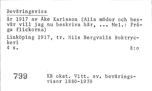 //// Beväringsvisa //// år 1917 av Åke Karlsson (Alla mödor och besvär vill jag nu beskriva här, ... Mel.: Fråga flickorna) //// Linköping 1917, tr. Nils Bergvalls Boktryckeri //// 4 s. 8: o //// 742 KB okat. Vitt. sv. bevärings- //// visor 1880-19 39 ////
