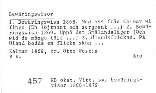//// Bewärings-Wisor //// 1, Bewäringswisa 1868. Med oss från Kalmar wi fingo (En löjtnant och sergeant ,..) 2» Bewäringswisa 1869. Uppå det Smålandsläger (Och wid de många tält ...) 3. Ölandsflickan. På Öland bodde en flicka skön //// Kalmar 1869, tr. Otto Westin 8 s. 8:o //// 384 KB okat. Vitt. sv. bevärings- //// visor 1800-3 879 ////