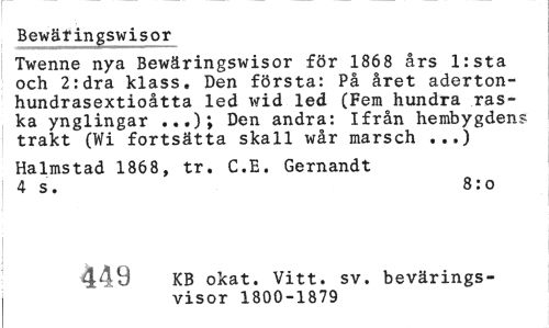 //// Bewärings-Wisor //// Twenne nya Bewäringswisor för 1868 års l:sta och 2:dra klass. Den första: På året aderton-hundrasextioåtta led wid led (Fem hundra raska ynglingar ...); Den andra: Ifrån hembygdens trakt (Wi fortsätta skall wår marsch ...) //// Halmstad 1868, tr. C.E. Gernandt 4 s. 8: o //// 384 KB okat. Vitt. sv. bevärings- //// visor 1800-3 879 ////