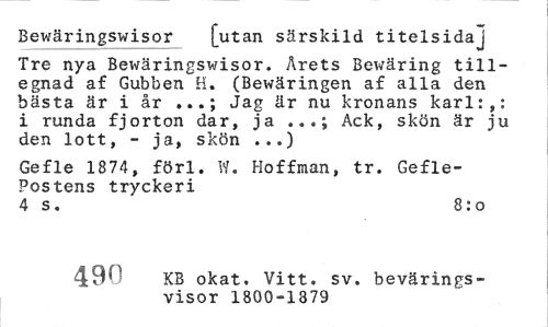//// Bewäringswisor [utan särskild titelsidaj //// Tre nya Bewäringswisor. Årets Bewäring till-egnad af Gubben H. (Bewäringen af alla den bästa är i år ...; Jag är nu kronans karl:,: i runda fjorton dar, ja .Ack, skön är ju den lott, - ja, skön ...) //// Gefle 1874, förl. W. Hoffman, tr. Gefle-Postens tryckeri //// 4 s. 8:0 //// KB okat. Vitt. sv. bevärings- //// visor 1800-1879 ////