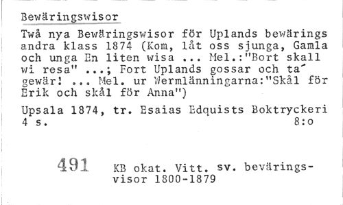 //// Twå nya Bewäringswisor för Uplands bewärings andra klass 1874 (Kom, låt oss sjunga, Gamla och unga En liten wisa ... Mel.:"Bort skall v/i resa" ...; Fort Uplands gossar och ta" gewärl ... Mel. ur Värmlänningarna:"Skål för Erik och skål för Anna") //// Upsala 1874, tr. Esaias Edquists Boktryckeri 4 s . 8: o //// 491 KB okat. Vitt. sv. bevärings- //// visor 1800-1879 ////