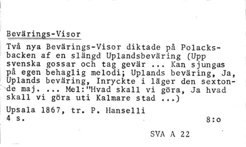 //// Bevärings-Visor //// Två nya Bevärings-Visor diktade på Polacksbacken af en slängd Uplandsbeväring (Upp svenska gossar och tag gevär ... Kan sjungas på egen behaglig melodi; Uplands beväring, Ja, Uplands beväring, Inryckte i läger den sextonde maj. ... Mel:"Hvad skall vi göra, Ja hvad skall vi göra uti Kalmare stad ...) //// Upsala 1867, tr. P. Hanselli //// 4 s. 8:0 //// SVA A 22 ////