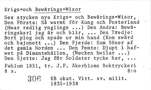 //// Krigs=och Bewärings=Wisor //// Sex stycken nya Krigs= och Bewärings=Wisor, Den Första: Så warrat för Kung och Fosterland (Hwar redlig ynglings ...) Den Andra: Bewä-ringskarl jag är och blir, ... Den Tredje: Bort plog och spade ur min hand (Kom swärd och bajonett .^Den Fjerde: Som Söner af det gamla Norden ... Den Femte: Djupt i haf-wet på Dimantehällen, (Necken hwilar ...) Den Sjette: Jag för Soldater tycke har, ... //// Fahlun 1851, tr. J.F. Åkerbloms Boktryckeri 8 s. 810 //// 3QR KB okat. Vitt. sv. milit. //// 1835-1938 ////