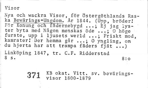 //// Visor //// Nya och wackra Visor, för östergöthlands Raska Bewärings=Ungdom. Är 1844. (Upp, bröder! För Konung och fädernebygd ..,; Ej jag lyster byta med Någon menskas öde ,..; 0 höge furste, upp i ljusets werld Friskt mod, //// kamrater.' Der hemma går 0 yngling, om //// du hjerta har att trampa fäders fjät .*.) //// Linköping 1847, tr. C.F. Ridderstad 8 s. 8:o //// KB okat. Vitt. sv. bevärings- //// J' X visor 1800-1879 ////