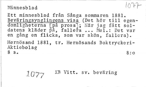 //// Minnesblad //// Ett minnesblad från Sånga sommaren 1881. Bevärinjjsynglingens visa (Det hör till egen-domligheterna f^på prosal; När jag fått soldatens kläder på, fallera ... Mel.: Det var en gång en flicka, som var skön, fallera). //// Hernösand 1881, tr, Hernösands Boktryckeri-Aktiebolag //// 8 s. ~ 8:o //// iQjy KB Vitt. sv. beväring ////