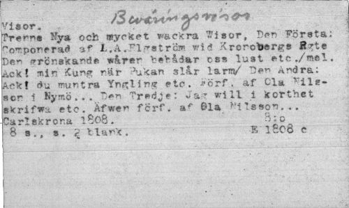 //// Via or. //// Trenne Nya och teycket vackra ™isor, Första: //// "omponerad af 1, A .Fl/ra t res? wid Xrorcbergs H?te D«ri Törakarde tmrer Y-e^ådar ess lust etc ./mel. äck! min' Kur><? r«år ;3u«can siar larn*/ T)er» Andra: Ark! du muntra Yn^lirm etc. *örf. af Ola 'Kil*, ser i Nymö. . . ~>r, Tredje: Ja-? will i korthet »krifwä etc. Afwen förf. af ©la Tsson. .. Carlakrona iS-OÖ. ' B:o //// 8 a., a. \ tlurk. K 1HC6 c ////