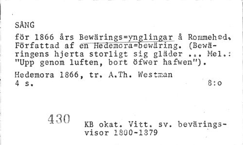 //// SÄNG //// för 1866 års Bewärings=ynglingar å Rommehed» Författad af en Hedemora=bewäring. (Bewä-ringens hjerta storligt sig gläder .8, Mel.: "Upp genom luften, bort öfwer hafwen"). //// Hedemora 1866, tr, A.Th. Westman 4 s. 8:o //// KB okat. Vitt. sv. bevärings- //// visor 1800-1379 ////