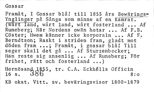 //// Gossar //// Framåt, I Gossar blå.' till 1855 års Bewärings» Ynglingar på Sånga som minne af en Kamrat. (Wårt land, wårt land, wårt fosterland ... Af Runeberg; När Nordens owän hotar ... Af F.B. Cöster; Hwem känner icke korporaln ... Af F. Berndtson; Raskt i striden fram, gladt mot döden fram Framåt, i gossar blå! Till //// seger skall det gå ... Af Sturzenbecker; Han reste sig ansenlig ... Af Runeberg; För frihet, rätt och fosterland ...) //// Hernösand 18£5, tr. C.A. Eckhélls Officin 16 s. Oöb 8:0 //// KB okat. Vitt. sv. beväringsvisor 1800-1879 ////