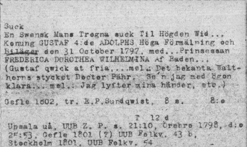 //// 3uek //// En Sw«n«5c Man» Trogna suek Til HÖgden Wid .. , Konung uUSTaP 4:4e ADOLPHS Höga Fö måln ing och //// lU.Täfjar den 31 öctober 1797. med___Prinsessan //// FREDEKICA DO KO THE A WILHEI2MNA Af Baden... (Gustaf qwick at fria, .. .»el u Det bekanta Walt-hems stycket Dector Pähr, 3e'r> Jag ned c?on klara... mel.; Ja^r lyfter mina händier, etc.) //// Oefle 1Ö02, tr. E.P.Sundqwist, 8 s. 8:0 //// . . . ' T ¦ 12 d ' ' " ' %: //// Upsala u», DIJB Z. P. s. 21:10, Örebro 1798, d:s . Oefle iPOl (?) UUB Pftlkv. 43 b, //// Sta^Vhelm t£f>1 TTTfR TT^Iirrr <A ////