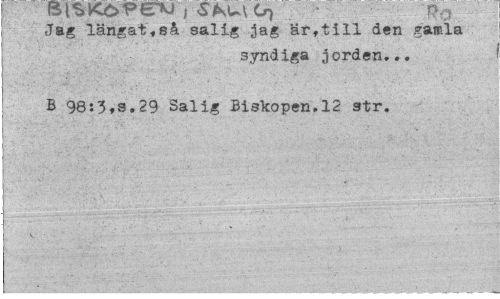 //// u | arvw r- ^ j o v-rj f,-.'^ //// Jag langat,så salig jag Er,till den gamla //// syndiga jorden,.. //// B 98:3,3.29 Salig Biskopen.12 str. ////