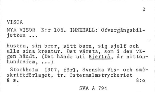 //// 2 //// VISOR //// NYA VISOR N:r 106. INNEHÅLL: Öfvergångsbil-jetten ... //// hustru, sin bror, sitt barn, sig sjelf och alla sina kreatur. Det värsta, som i den vägen händt. (Det hände uti Biertrå. år nitton-hundrafem, ...) //// Stockholm 1907, förl. Svenska Vis- och småskriftförlaget. tr. östermalmstryckeriet 8 s. 8:o //// SVA A 794 ////