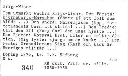 //// Krigs-Wisor //// Fem utmärkt wackra Krigs-Wisor. Den Första: Björneborgs=Marschen (Söner af ett folk som blödt ...) Den Andra: Marseljäsen (Upp, fosterlandets barn att stridal ...) Den Tredje: Carl den XII (Kung Carl den unga hjelte ...) Den Fjerde: Korpral Krut. Efter en folktradition. (Mig lyster sjunga om en knekt ...) Den Femte: Grenadierens Sång (Rask och käck är Sv/eriges militär ...) //// Köping 1876, tr. I.F. Säfberg 8 s. 8:0 //// KB okat. Vitt. sv. milit. 340 1835-1938 ////
