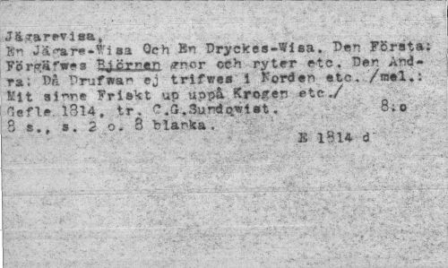 //// J&?arevjsa, //// Kn Jä^ar«-Wj sa Och Bm Dryckes«Wisa. Den Första;-Förpjifwe3 Sjffrw^p wor och ryter etc. Den Andra: Då Drufwan ej trifwes i Kprdsn etc, /»»!.: Kit sinne Friskt up ups>å Krogen etc./ Tefle. 1814. tr. C.G.Sundqvist. 8;o //// 8 s. 2 o. 8 blanka. //// ' E 1SU d //// ,"."¦' * ' ' ; ¦ - •. • "V "'••.,. -v- ¦ - ~ ' •¦•¦.¦ ¦: • ¦'' ¦-* //// ". - V " ' „.," :.-.. ' ' " r-.-v ¦¦ ¦'¦ V 1 •••-,*" -'v . ' - ////