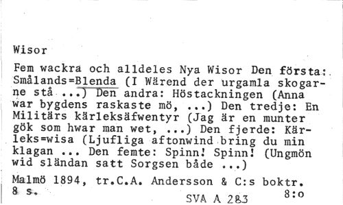 //// Wisor //// Fem wackra och alldeles Nya Wisor Den första;. Smålands=B1enda (I Wärend der urgamla skogarne stå ...) Den andra: Hös täckningen (Anna war bygdens raskaste mö, ...) Den tredje: En Militärs kärleksäfwentyr (Jag är en munter gök som hwar man wet, ...) Den fjerde: Kär-leks=wisa (Ljufliga aftonwind bring du min klagan ... Den femte: Spinn.' SpinnI (Ungmön wid sländan satt Sorgsen både ...) //// Malmö 1894, tr.C.A. Andersson & C:s boktr. 8 s* 9VA A 8:0 ////