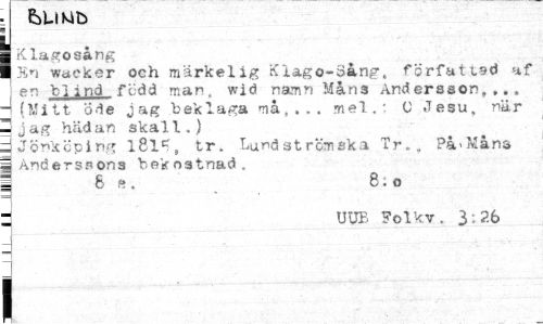 //// ¦ CiLiMb //// (Klagosång //// »i waeker och märkelig Klago-3ang, författad af en blind född man, wid namn Måns Andersson,,.. - (Mitt öde jag beklaga må,,., mel.: C Jesu, när ^jag hädan skall.) //// | Jönköping l8lc, tr. Lundströmska Tr,, På > Måna | Anderssons bekostnad. 1 6 n, 8; o //// d UUB Folkv. 3 ; 26 //// i ////