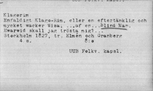 //// KlaRorim //// Enfald ig t Klago-Rim, eller en eftertänklig och mycket wacker Wisa, »„.af er,. .b11na Man. Hwarwid skall jag trösta mig t. Stockholm 1827» tr. Elmén och C/ranberr 4 3 s 8 ;. o //// UUB Folkv. kapsi. ////