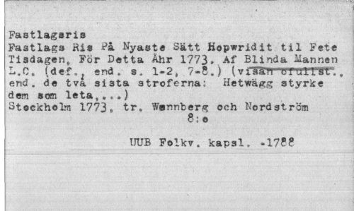 //// Fastlagsris //// Fastlass Ris På Nyaste Sätt Hopwridit til Fete Tisdagen, För Detta Åhr 1773, Af Blinda Mannen L.C. (def. l end. s. 1-2, 7-8.) (v fasTrrTrrnrrST' , end. de tva sista stroferna; Hetwägg styrke dem som leta,. ».) //// Stockholm 1773» tr. Wnnnberg och Nordström //// 8; o //// IJUB Folkv. kapsl» »178? ////
