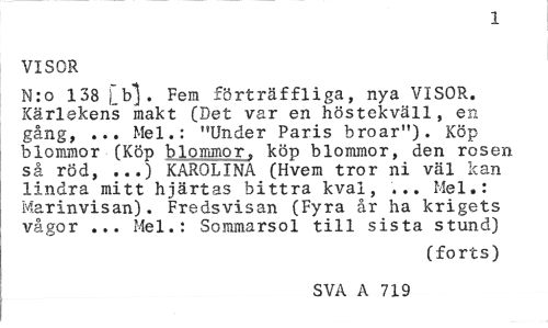 //// 1 //// VISOR //// M:o 138 [b]. Fem förträffliga, nya VISOR. Kärlekens makt (Det var en höstekväll, en gång, ... Mel.: "Under Paris broar"). Köp blommor (Köp blommor, köp blommor, den rosen så röd, ...) KAROLINA (Hvem tror ni väl kan lindra mitt hjärtas bittra kval, ... Mel.: Marinvisan). Fredsvisan (Fyra år ha krigets vågor ... Mel.: Sommarsol till sista stund) //// (forts) //// SVA A 719 ////