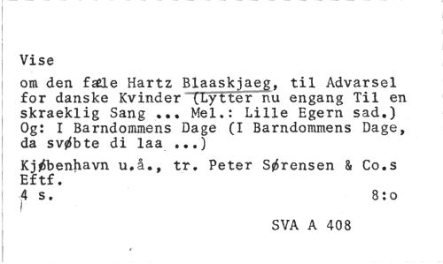 //// Vise //// om den faöle Hartz Blaaskjaeg, til Advarsel for danske Kvinder (Lytter nu engang Til en skraeklig Sang ... Mel.: Lille Egern sad.) Og: I Barndommens Dage (I Barndommens Dage, da sv^bte di laa ...) //// Kjjébenhavn u.å., tr. Peter S^rensen & Co.s Ef tf. //// 4 s. 8:0 //// 1 //// SVA A 408 ////