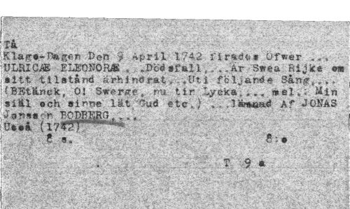 //// rUg^Bfcgefl Den 9 April 1742 flr$<$*« Ofwer ..* ULRICJB ELEONORÄ » .Död afall, . . - Ar Swea Ri J •* titt tilatånd ärhindrat. .Uti fcljande San? ... //// (BBttacfc, 01 nu tir Lycka--- //// siäl och ainne lät^ud etc,} , Jwwad Af JOJ.AS Jonaacn BODBfåRS „... //// 8 a, 6:0 //// T 9 a ////