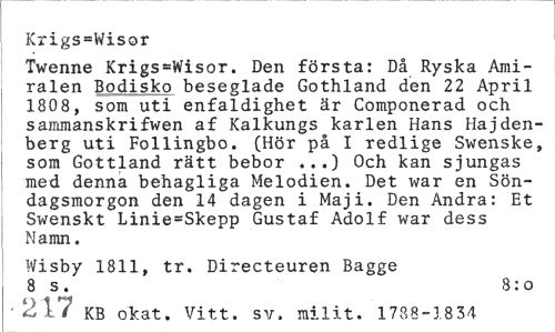//// Krigs=Wisor //// Twenne Krigs-Wisor. Den första: Då Ryska Amiralen Bodisko beseglade Gothland den 22 April 1808, som uti enfaldighet är Componerad och sammanskrifwen af Kalkungs karlen Hans Hajden-berg uti Follingbo. (Hör på I redlige Swenske, som Gottland rätt bebor ...) Och kan sjungas med denna behagliga Melodien. Det war en Söndagsmorgon den 14 dagen i Maj i. Den Andra: Et Swenskt Linie=Skepp Gustaf Adolf war dess Namn. //// Wisby 1811, tr. Directeuren Bagge 8 s. 8: o //// 217 KB okat. Vitt. SV. milit. 1788-1834 ////