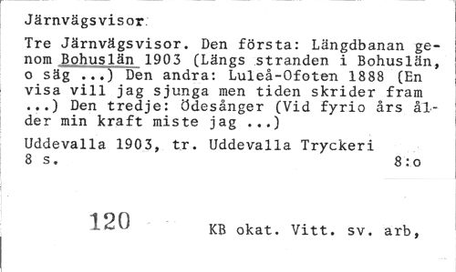 //// Järnvägsvisor //// Tre Järnvägsvisor. Den första: Längdbanan ge-nom Bohuslän 1903 (Längs stranden i Bohuslän, o säg ...) Den andra: Luleå-Ofoten 1888 (En visa vill jag sjunga men tiden skrider fram ...) Den tredje: ödesånger (Vid fyrio års ålder min kraft miste jag ...) //// Uddevalla 1903, tr. Uddevalla Tryckeri 8 s. 8 :o //// 120 KB okat. Vitt. sv. arb, ////