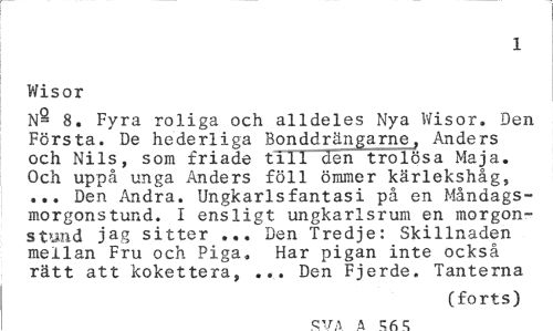 //// 1 //// Wisor //// N- 8. Fyra roliga och alldeles Nya Wisor. Den Första. De hederliga Bonddränjgarne, Anders och Nils, som friade till den trolösa Maja. Och uppå unga Anders föll ömmer kärlekshåg, ... Den Andra. Ungkarlsfantasi på en Måndagsmorgonstund. I ensligt ungkarlsrum en morgonstund jag sitter ... Den Tredje: Skillnaden mellan Fru och Piga» Har pigan inte också rätt att kokettera, ... Den Fjerde. Tanterna //// (forts) //// C TA A C 6. C ////