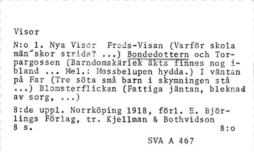 //// Visor //// N:o 1. Nya Visor Freds-Visan (Varför skola män"skor strida? .,.) Bondedottern och Tor-pargossen (Barndomskärlek äkta finnes nog i-bland Mel.: Mossbelupen hydda.) I väntan på Far (Tre söta små barn i skymningen stå .».) Blomsterflickan (Fattiga jäntan, bleknad av sorg, «..) //// 8:de uppl. Norrköping 1918, förl. E. Björ-lings Förlag, tr. Kjellman & Bothvidson 8 s. 8 : o //// SVA A 46 7 ////