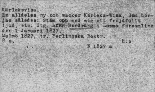 //// ** ' - \t3. Fl //// Kärleksvis», //// Än alldeles ny och wscker Kärleka-Wisa, San t örjas således: St«m opp med mlf? ett fröjdfullt ljud, etc. Utg. afBtf Bowlräng i Lomma församling dén 1 Januari 1827. "" Malmö 1827, tr. Berlinsska Boktr. P «. 8:o //// / • » 1827 a //// '¦*':¦* • • 1:". - ¦ //// -,}¦- ~ 4 • ••••• -v .A* . X ... .>,.-v.-." • ..;• ;.. //// - - •"/¦ ,1 " . t-.. ' //// ¦ v^r ; "S-V- • v - //// •• ¦ ¦¦, "v/.- ».Vrr-yv* //// :."*•• v ...- . V. •• .. ' . '/V • //// - . r < x^fy' ¦ //// .•¦•¦¦. •. v. , / • C ' V ¦ " : ////