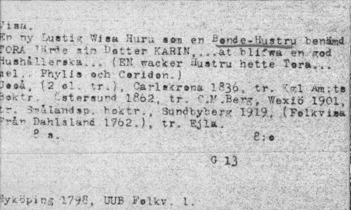 //// £n ny Lustig Wisa Huru ««n en ii t nå e -H^strp benamd ?OBA 'arSe sin bett er KARIN,,., a t blifwa en god iushallerska». * I EN vracker Hustru hette Tora... jel,. Phylis ech Ceridon.) //// ;•»&. (2 el. tr.), Carl skr »na l£36, tr. Kgl a»; t» äektr . i st er sund 1862, tr. C .K .Berg, Wexiö 1901» tr. 3?iland»p. hoktr., Sundbyberg 1919, (Felkvisa Prån Öahisland 1762.)» tr. //// ? s. 2: • //// 0 13 //// Kr.i »i.r TTTm Fal V V . 1 . ////