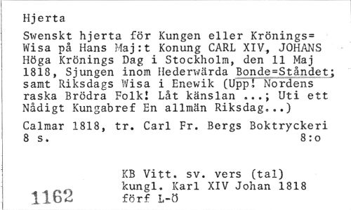 //// Hjerta //// Swenskt hjerta för Kungen eller Krönings= Wisa på Hans Maj:t Konung CARL XIV, JOHANS Höga Krönings Dag i Stockholm, den 11 Maj 1818, Sjungen inom Hederwärda Bonde=Ståndet; samt Riksdags Wisa i Enewik (Upp! Nordens raska Brödra Folk! Låt känslan ...; Uti ett Nådigt Kungabref En allmän Riksdag,..) //// Calmar 1818, tr. Carl Fr. Bergs Boktryckeri 8 s. 8 :o //// KB Vitt. sv. vers (tal) kungl. Karl XIV Johan 1818 //// 1162 förf L-ö ////