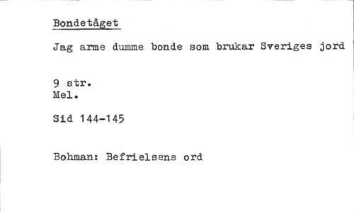//// Bondetåget //// Jag arme dumme bonde som brukar Sveriges jord //// 9 str. Mel. //// Sid 144-145 //// Bohman: Befrielsens ord ////
