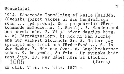 //// Bondetåget * //// 1914. Kåserande Tonmålning af Nalle Halidén. (Svenska folket väckes ur sin hundraåriga sömn ... [på prosa]. De i potpourriet förekommande melodierna. 1. Revelj. 2. Mandom mod och morske män. 3. Vi gå öfver daggiga berg. 4. a) Järnvägs galopp, b) Ack ni kan aldrig ana hur vackert Stockholm är. 5. Nu har jag sprungit mig trött och fördärfvad ... 6. In der Nacht. 7. Hör oss Svea. 8. Engelbrektsmar-schen. 9. Du gamla, du fria - Ur svenska hjärtans djup. 10. Här dånet hörs af klackar. //// 1005" (forts) //// KB okat. Vitt. sv. hist. 1871 - ////