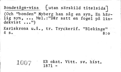 //// Bondetågs-visa £utan särskild titelsida^ //// (Och "bonden" Nyberg han såg en syn, En härlig syn, ... Mel.:"Där satt en fogel på lindekvist ...") //// Karlskrona u.å., tr. Tryckerif. "Blekinge" 4 s. 8:0 //// 1 fi n 7 KB okat. Vitt. sv. hist. //// -lxju/ 18?1 . ////