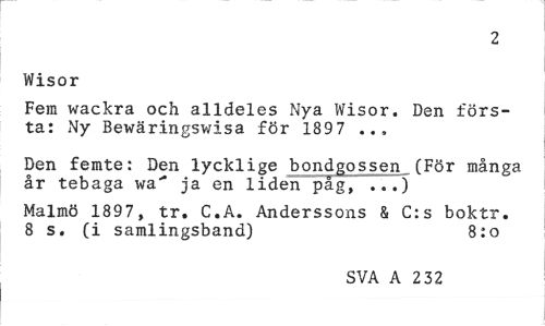 //// 2 //// Wisor //// Fem wackra och alldeles Nya Wisor. Den första: Ny Bewäringswisa för 1897 ... //// Den femte: Den lycklige bondgossen (För många år tebaga wa" ja en liden påg, ...) //// Malmö 1897, tr. C.A. Anderssons & C:s boktr. 8 s. (i samlingsband) 8:o //// SVA A 2 32 ////